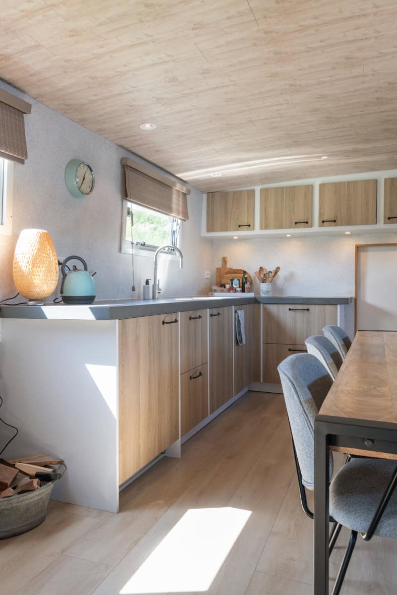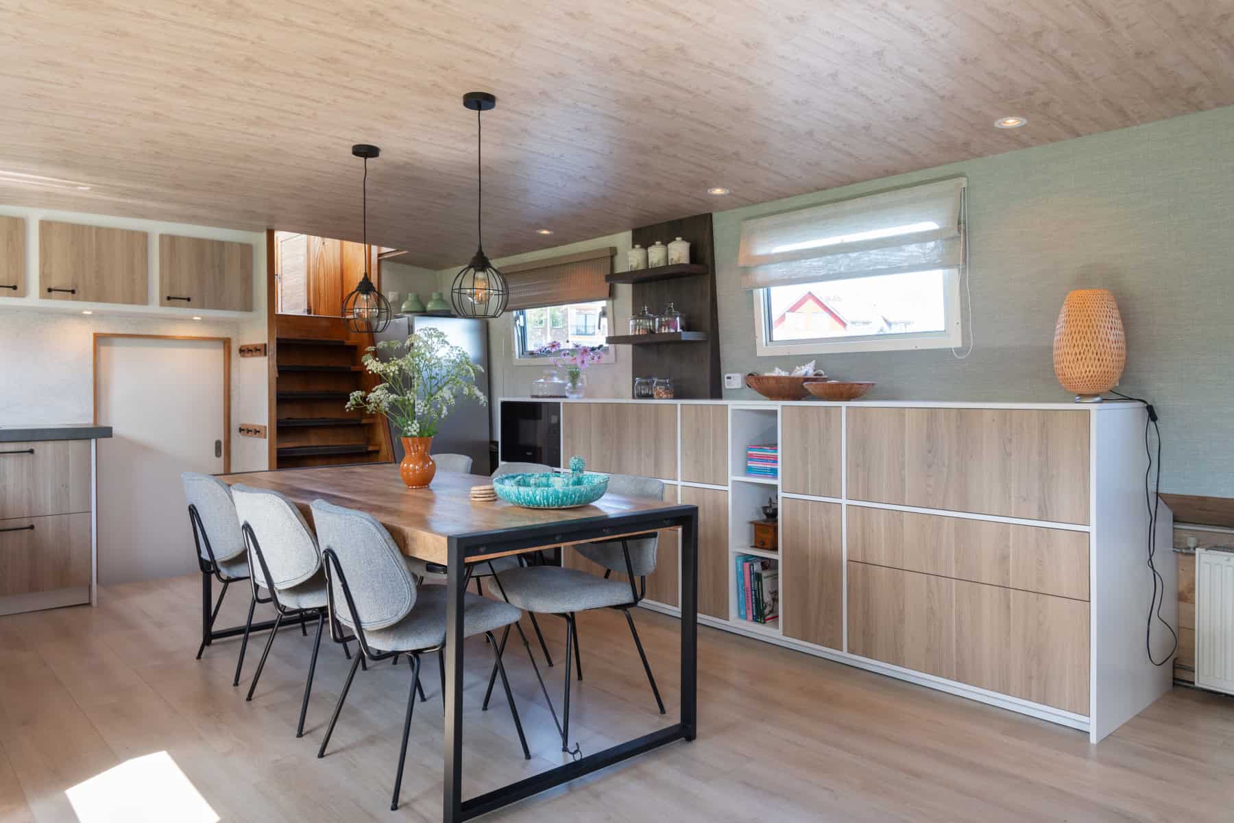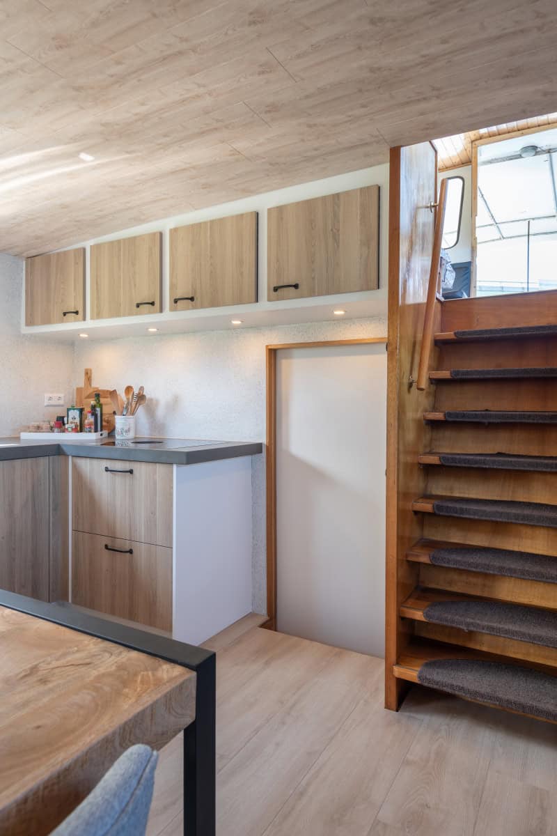 Het bestaande ontwerp was hokkerig, dus het stel wilde het openbreken. “Normaal zou je een scheepstimmerman inhuren, want niks is recht of waterpas op een schip. Maar wij hadden in ons vorige huis ook al een keuken laten maken door Van Slageren en waren daar heel tevreden over. Ze kunnen veel op maat maken en meedenken. Daarom zijn we weer bij hen uitgekomen.”